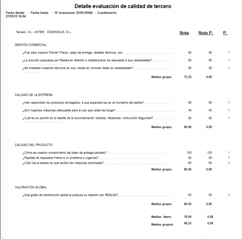 Permite evaluar la calidad de un cliente o proveedor. Éste debe de tener configurado en su ficha el código del esquema de evaluación por el que se le va a evaluar.